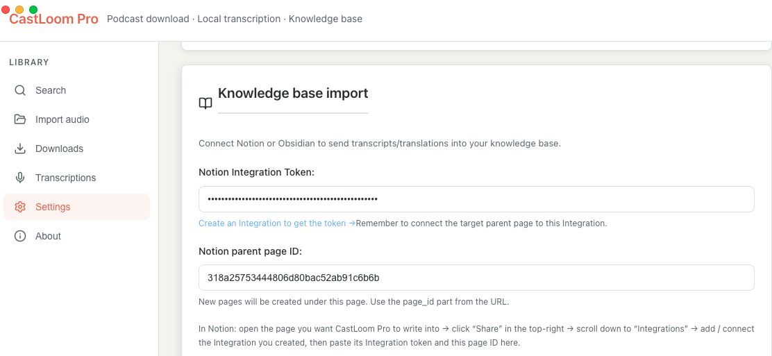 The page URL looks like https://www.notion.so/318a25753444806d80bac52ab91c6b6b . The last part (e.g. 318a25753444806d80bac52ab91c6b6b) is the page ID. Paste that into "Notion parent page ID" in CastLoom Pro.