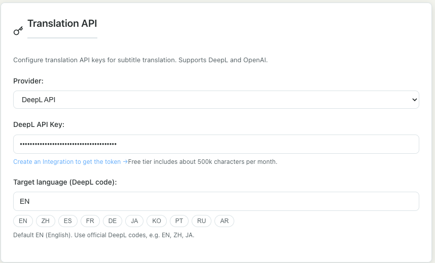 We support DeepL and OpenAI for translation. We recommend DeepL: the free tier gives you around 500,000 characters per month and the quality is great.