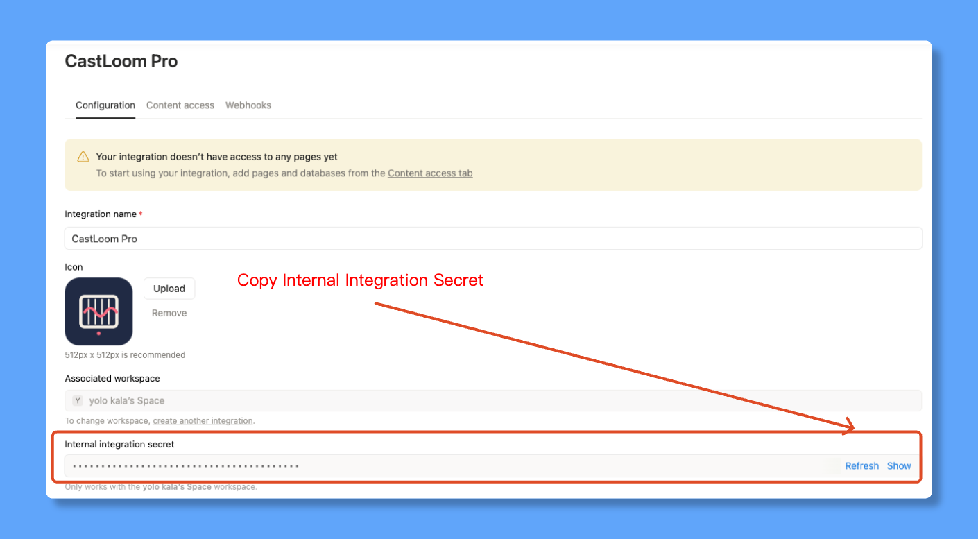 Copy the "Internal API integration secret" from the page and paste it into the "Notion Integration Token" field in CastLoom Pro.