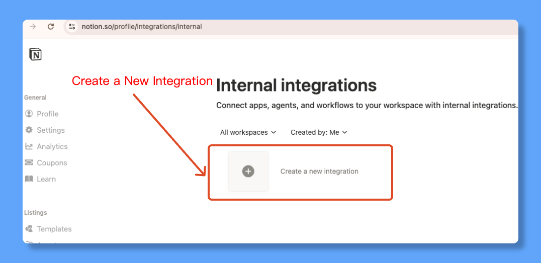 Log in to Notion, open the link below, and click "New integration".