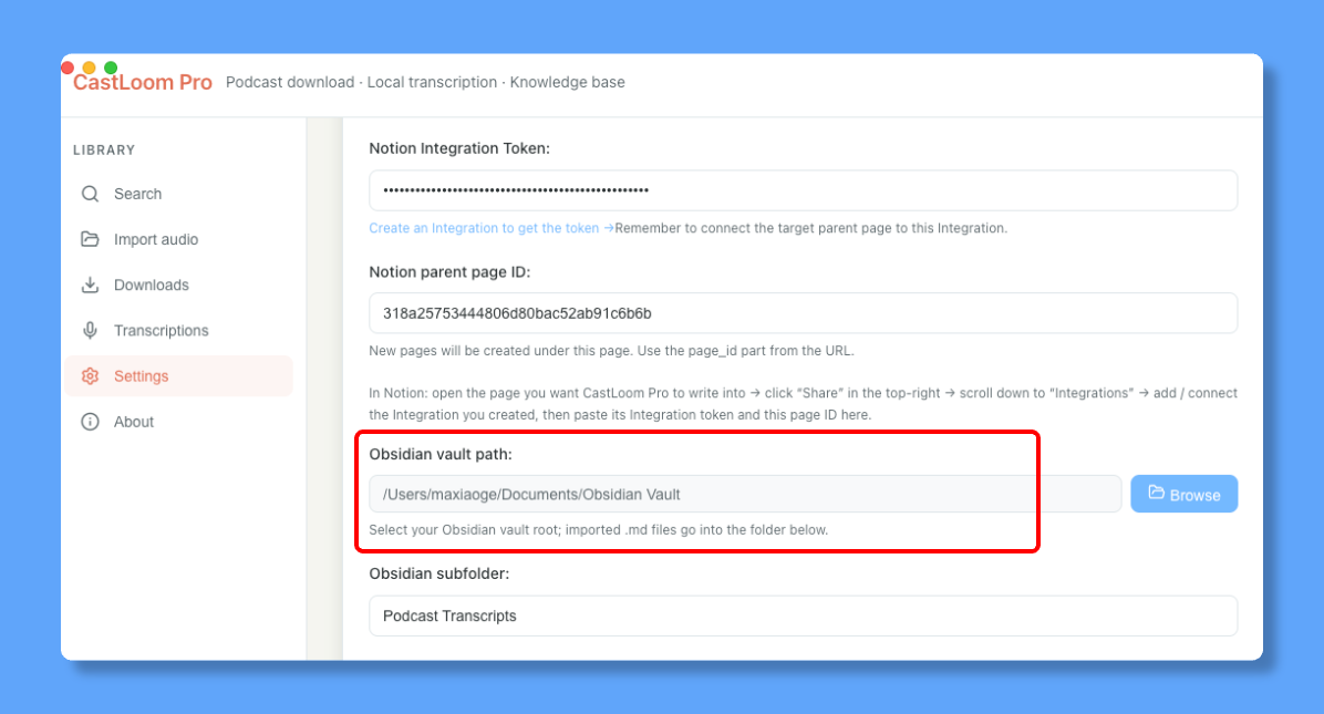 In CastLoom Pro, select the folder on your computer where your Obsidian vault is stored.