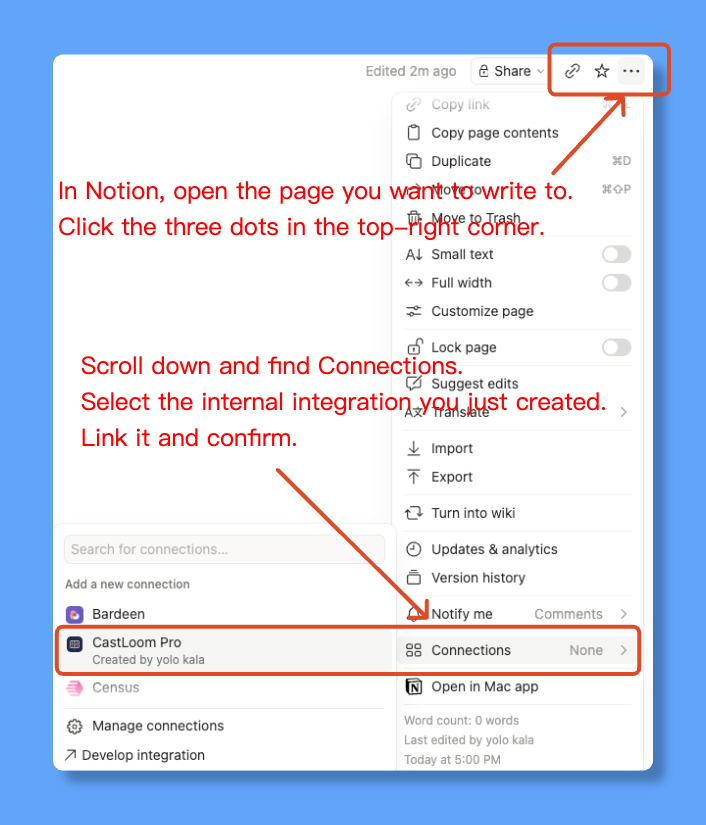 In Notion, open the page you want to write to. Click the "⋯" in the top right → scroll to "Connections" / "Integrations" → connect the integration you created and confirm.