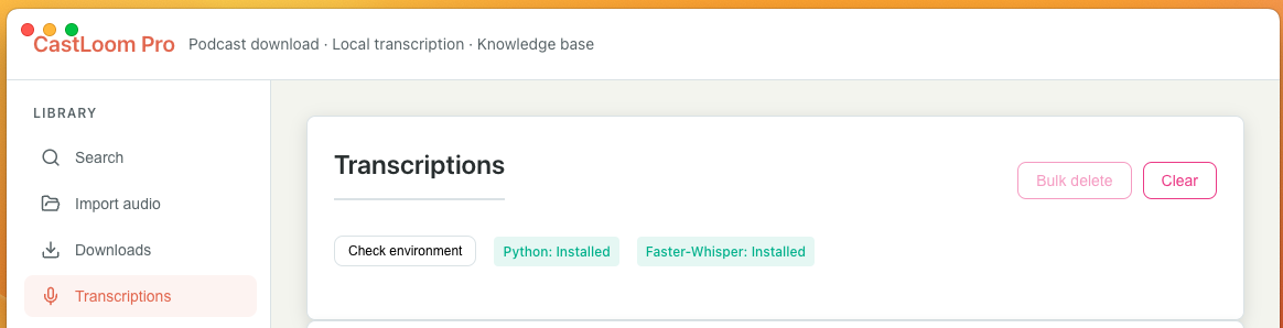 After the download finishes, open "Transcription tasks" and check "Check environment". If you see [Python: Installed, Faster-Whisper: Installed], you're good to use transcription.