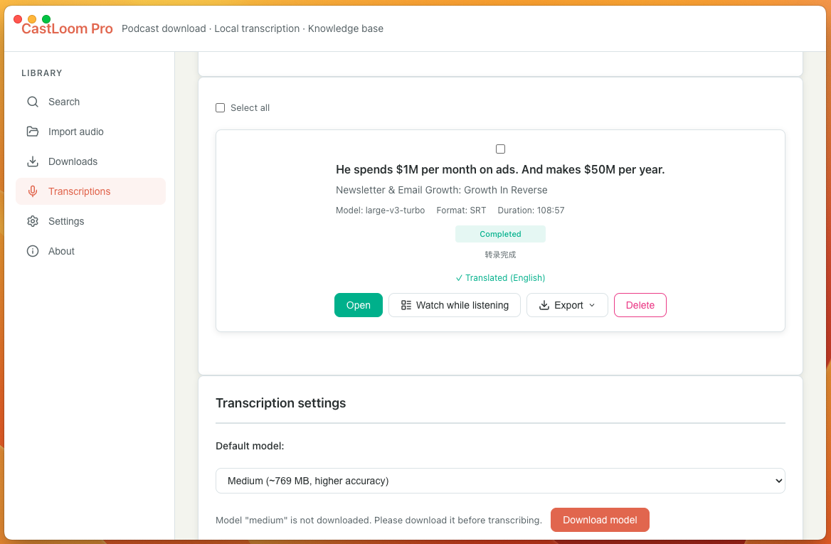 CastLoom Pro uses Faster-Whisper and supports several models. Pick one based on your trade-off between speed and accuracy: