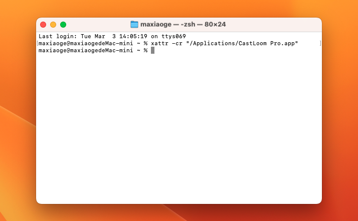 If you see "No such file", the app isn't in Applications. Type xattr -cr (with a space at the end), then drag the CastLoom Pro icon from Finder into the Terminal window. The path will be filled in. Press Enter.