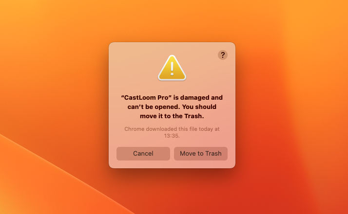 CastLoom Pro isn't on the App Store, so the first time you open it, macOS may say it's "damaged" or can't be opened. Don't worry — the app is fine. Just follow the steps below to clear the security block.