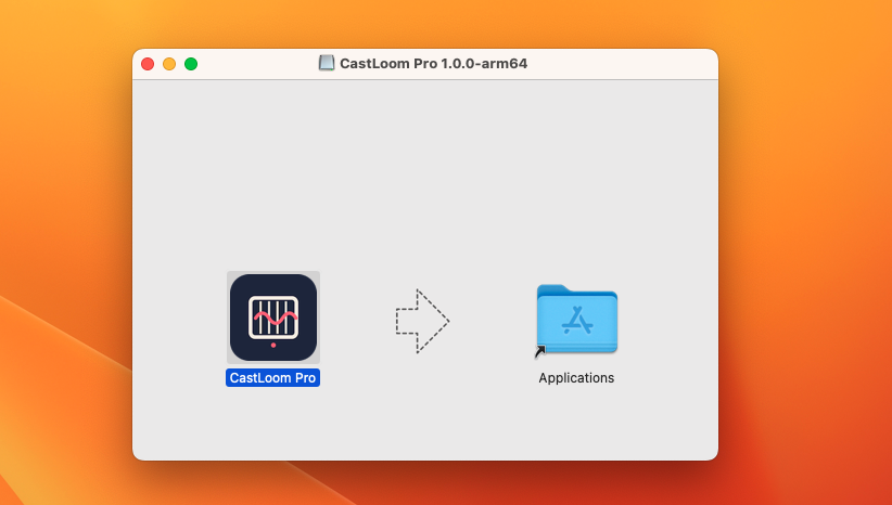 When the download finishes, open the DMG. You'll see the CastLoom Pro icon. Drag it to the Applications folder on the right (as shown in the arrow). That's the install.